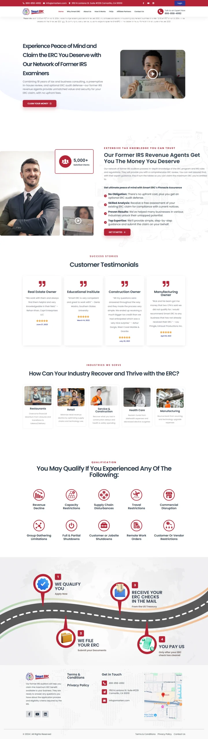 Smart ERC approached us with a mission to simplify a complex process: helping businesses across industries claim the Employee Retention Credit (ERC) with confidence. With former IRS agents on their team, they needed a website that communicated credibility, process transparency, and professional trust.